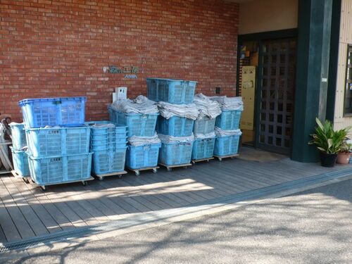 朝、森の工房AMAの入り口に折りたたんだ作業服が積まれている。 この荷物をトラックに積んで、 南区のクリーニング工場に納品する。今日の当番は森の工房やの・生活介護オリーブ班だ。 森の工房AMAの屋上のブルーベリーの剪定5。南側は7列植えている。6列が…