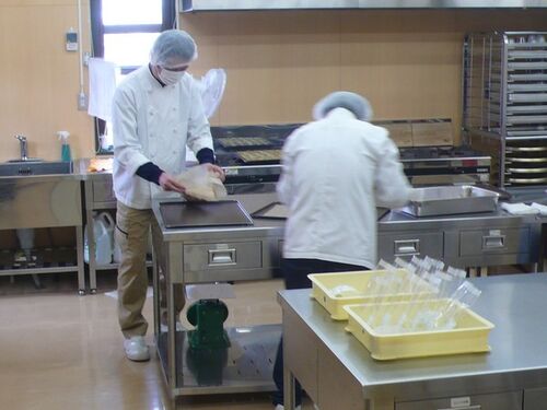 ①森の工房みみずく・就労継続支援B型食品班。クッキーが焼けた。 まだ熱いクッキーを集める。 ②森の工房みみずく・生活介護なつめ班。台車に段ボールに入った新聞紙をのせる。 コンテナに入っている新聞紙ものせて外の倉庫に移動させる。 森の工房AMAの庭の…