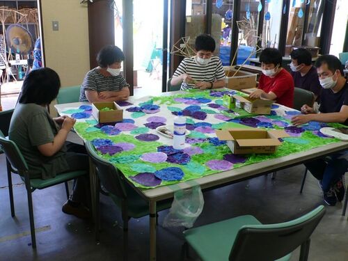 7月21日(水)。森の工房やの・生活介護の創作活動の作品の仕上げをもくれん班で行っている。 ブルーベリーの実や葉っぱを利用者のみんなで作った後でまとめの模造紙にランダムに貼り付けていく。 たくさんのブルーベリーの実や葉を貼るのでせんたくのりを使…