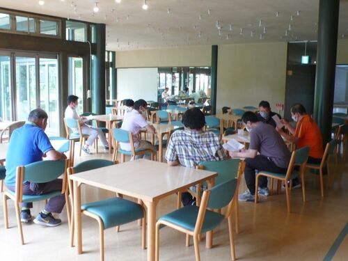森の工房AMAの食堂で自治会を行うのは森の工房みみずく・就労継続支援B型あきのみなさん。 テーマは研修旅行。職員から日程の説明と資料として行く先のパンフレットが配られた。 9月に日帰りで行く予定で平田観光農園のパンフレットが見える。梨の実る季節だ…