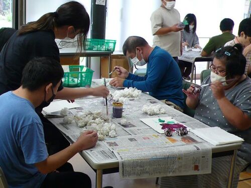 9月14日(火)の森の工房みみずく・生活介護は午後から創作活動。 白い紙をたくさん丸めていく。 緑や紫の色を付けていく。 どうやらぶどうのようで通路の掲示板の上あたりに飾った。 丸めた紙は色を塗りくっつけて房状にして上に葉をつけて、クズの葉と弦を…