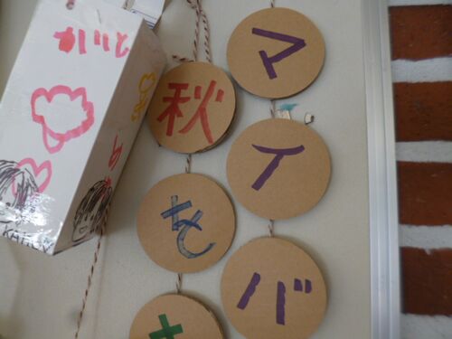 マイバックで秋を探そうをテーマに牛乳パックで工作するのは森の工房みみずく・生活介護の皆さん。 その作品が作業室の通路に展示されている。 各自探したものは牛乳パックに絵を描く。栗が入ったのもある。 安芸の郷にブルーベリーを納品している東広島市豊…