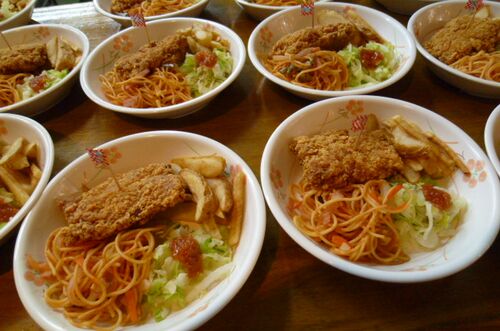 12月の給食献立表には「ちょっと早いクリスマス」と記載されている今日の給食のメニューのメインはチキンの揚げ物。 チキンにたてられた爪楊枝の旗は調理員手製のもの。 12時になりチキンの入ったトレーを持ち利用者がそれぞれテーブルに着く。 ご飯大盛の利…