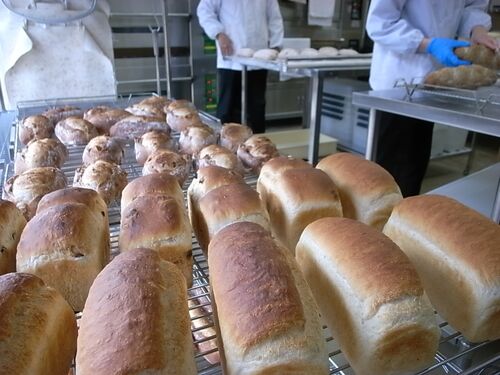 焼き上がったパンがラックに並ぶパン工房。(森の工房あやめ就労継続支援B型) 今日はいつもより製造量が多く、仕分けるケースも多い。「cafeさくら」や地下街シャレオにある「ふれ愛プラザ」へ納品するパンと23日(日)に開催される「瀬野福祉センターまつ…