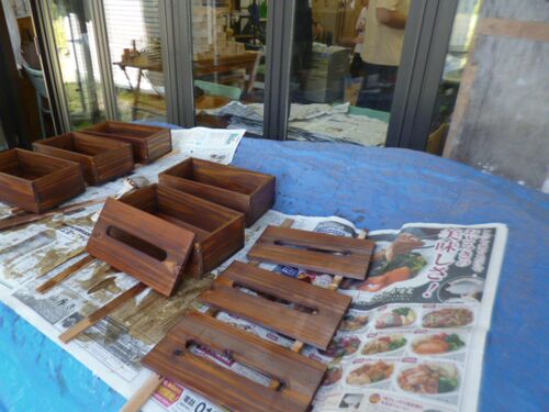 9月29日(金) 塗装の済んだティッシュボックス。板は杉で森の工房やの・生活介護もくれん班で製造している。 乾燥は屋外なのでもくれん班の作業室と隣り合わせになっている。 作業室内の隅に木工作業を行うコーナーがある。今日はブルーベリー生食を入れる…