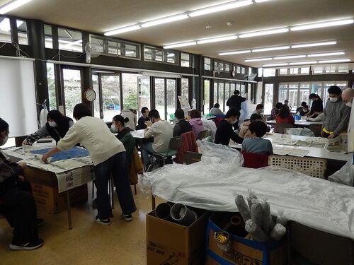 3月12日(火) 午後からの自由活動では4月6日(土)にある森の工房みみずくの花見に掲げるサクラをテーマにした共同制作の作品作りを行った。 いくつかのグループに分かれて模造紙に青い絵の具を全面に塗り青空を描く。乾いたらその上にサクラの花弁を貼り…