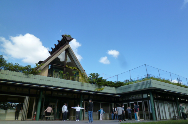 2022-10-14 森の工房AMAの庭で 体操とダンスと紅葉とベゴニア6 ラジオ体操 昼休み ベゴニア 森の工房AMAの庭で。 三角屋根とバックに広がる青空のもと朝のラジオ体操が始まる。 昼休みには木陰でスマホの動画を見ながらいつものダンスをする利用者2人。散歩する人もいる。 ダンスの木陰になったモミジは一部が紅葉している。 地下室の外の通路で栽培中のエラチオールベゴニア6。白色で一重のタイプ。