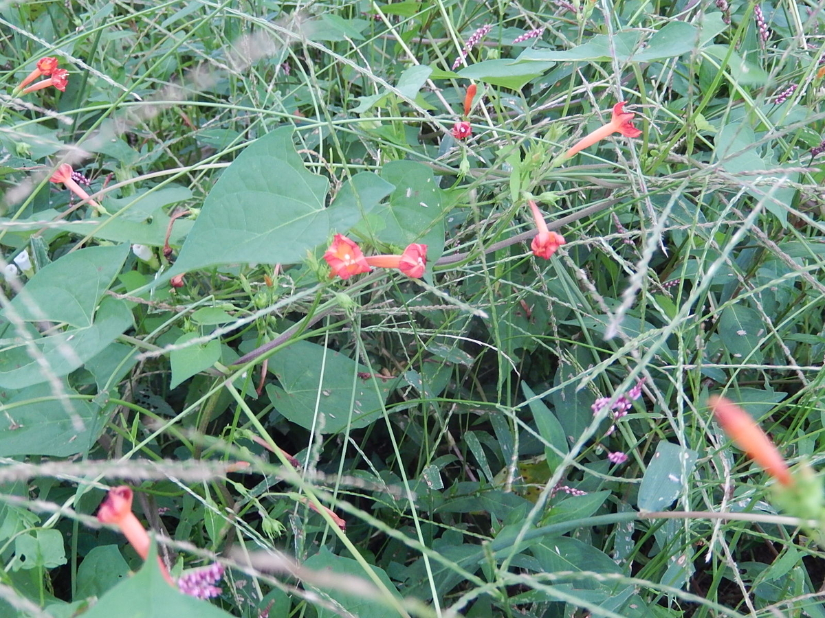 農園の隣の大豆を植えている畑にマルバルコウソウがつるを絡ませて花を咲かせている。