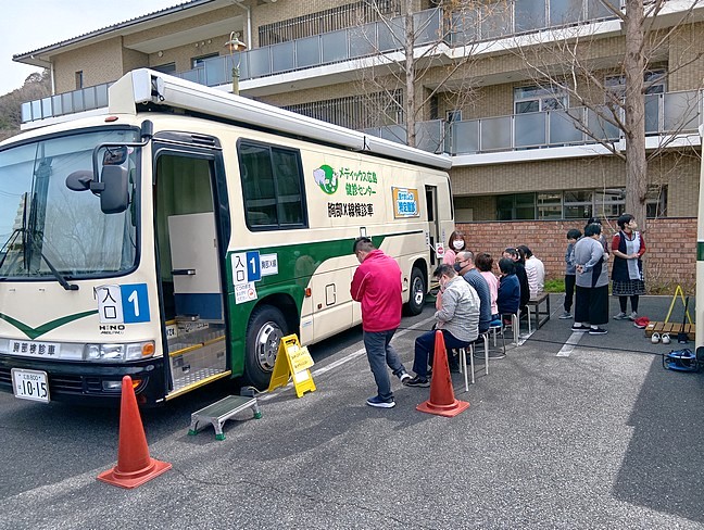 今日は年に1回実施している健康診断の日。安芸の郷を利用している利用者と一部の職員が受診した。外の駐車場には検診車が2台来て胸部のX線検査を受ける。